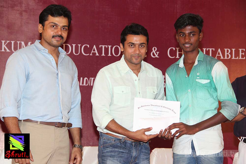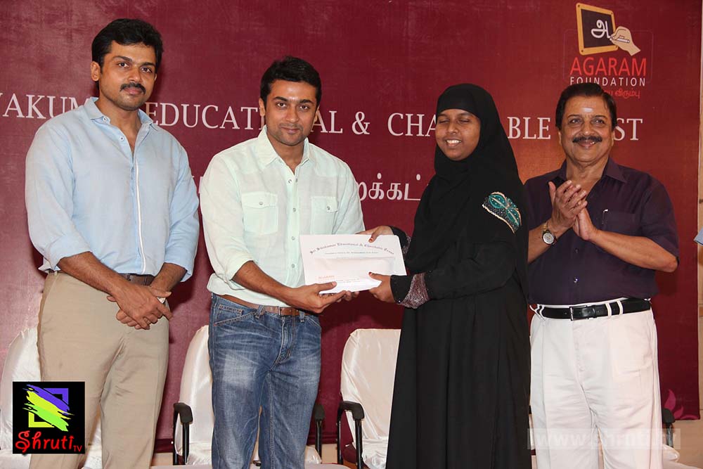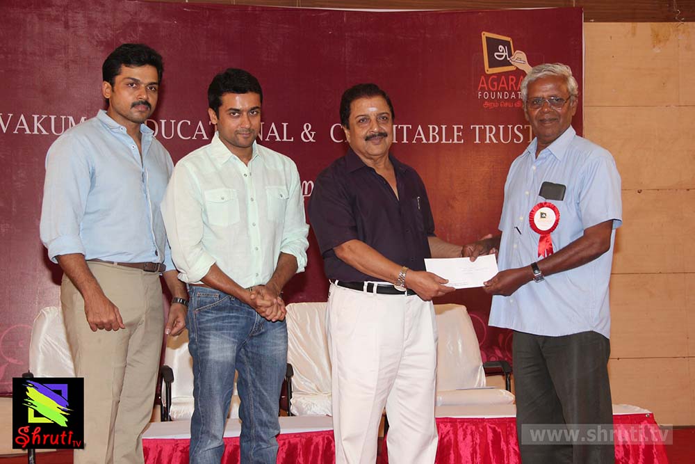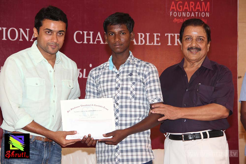 விழாவில் மாணவர்களுக்கு பரிசளித்து, மேலும் கல்விக்காக பாடுபடும் இரண்டு அமைப்புகளுக்கு நிதி உதவியும் அறித்தார். அகரம் ஃபவுன்டேஷன் நிறுவனர் நடிகர் சூர்யா. தொடர்ந்து பேசிய சூர்யா “அகரம் ஃபவுண்டேஷன் நம் சமூகத்தில் இருக்கும் அடித்தட்டு மக்களின் கல்வி வளர்ச்சிக்கு தன்னால் முடிந்த பணிகளைச் செய்து வருகிறது. இந்த ஆண்டோடு உயர்கல்வி பெறும் மாணவர்களின் எண்ணிக்கை 1300ஆக உயர்ந்துள்ளது. தனிப்பட்ட முறையில் எனக்கு இது சாத்தியம் இல்லை, தகுதியுள்ள ஏழை மாணவர்களின் கல்லூரி கனவை, பல நல்ல உள்ளம் கொண்டவர்களின் உதவியோடு நனவாக்கி இருக்கிறோம். தமிழகத்தில் தரம் வாய்ந்த கல்வி நிறுவனங்கள் அகரம் மூலம் தேர்ந்தெடுக்கப்படும் மாணவர்கள் இலவசமாக படிக்க வாய்ப்பு தருகின்றன. தரமான கல்வி ஏழை மாணவர்களுக்கு கிடைக்க கரம் கோர்த்து உதவும் அனைவருக்கும் இந்த நல்ல நேரத்தில் எனது மனமார்ந்த நன்றியயை தெரிவித்துக் கொள்கிறேன் என்று கூறினார் சூர்யா.