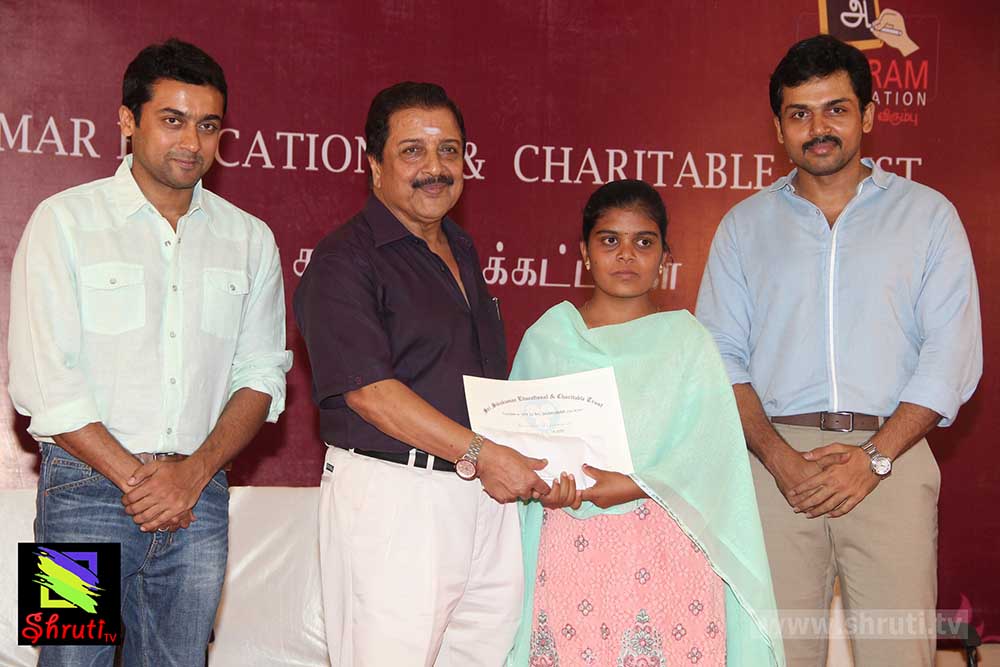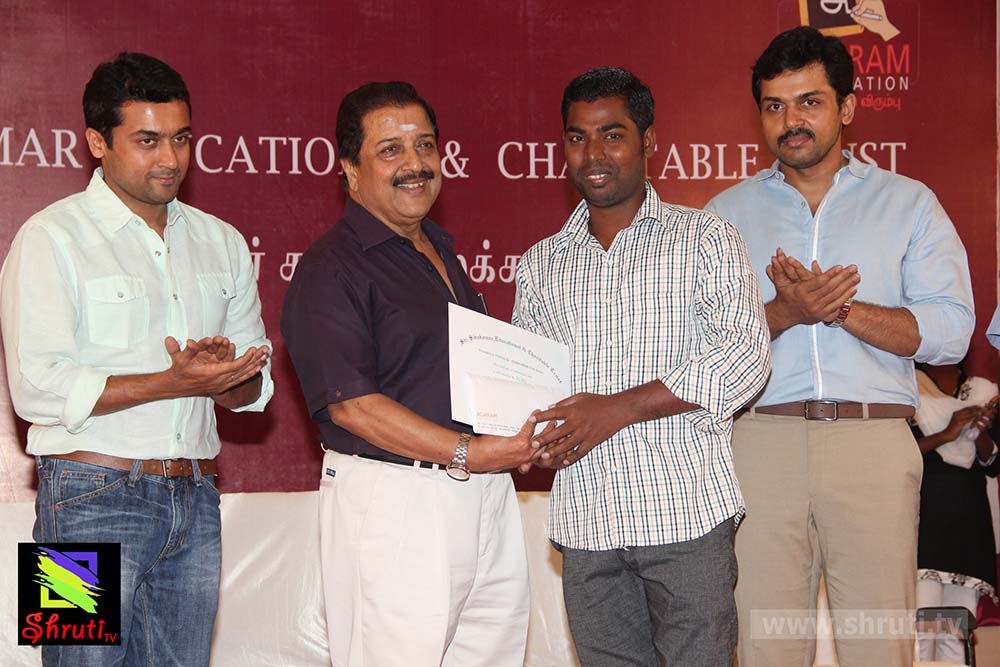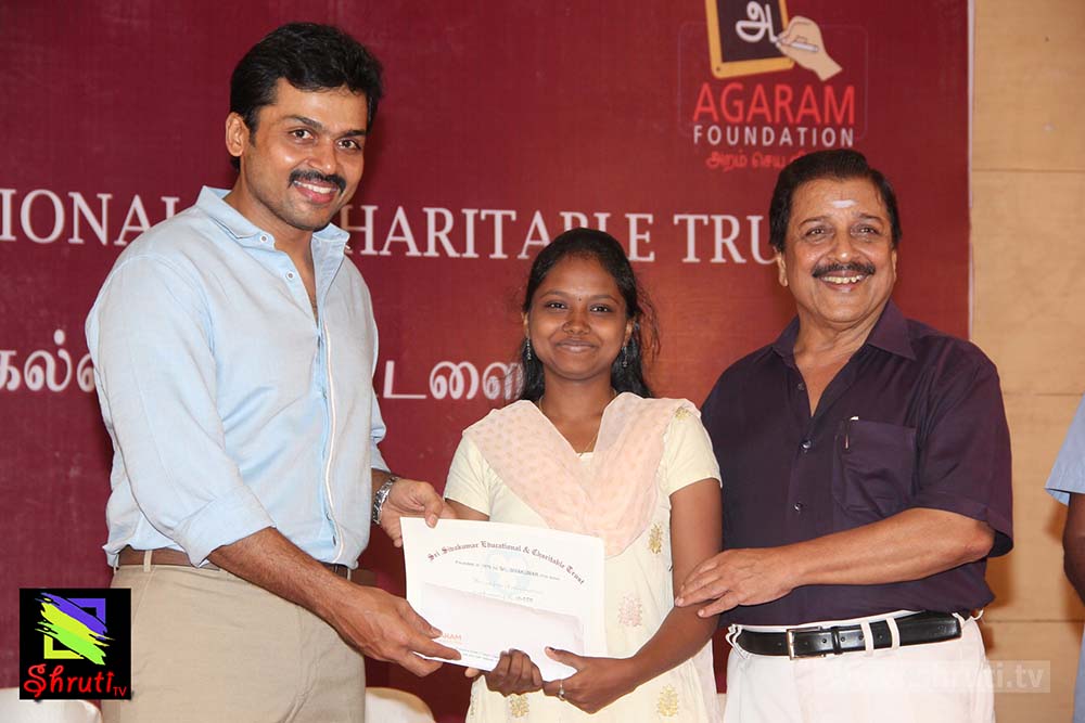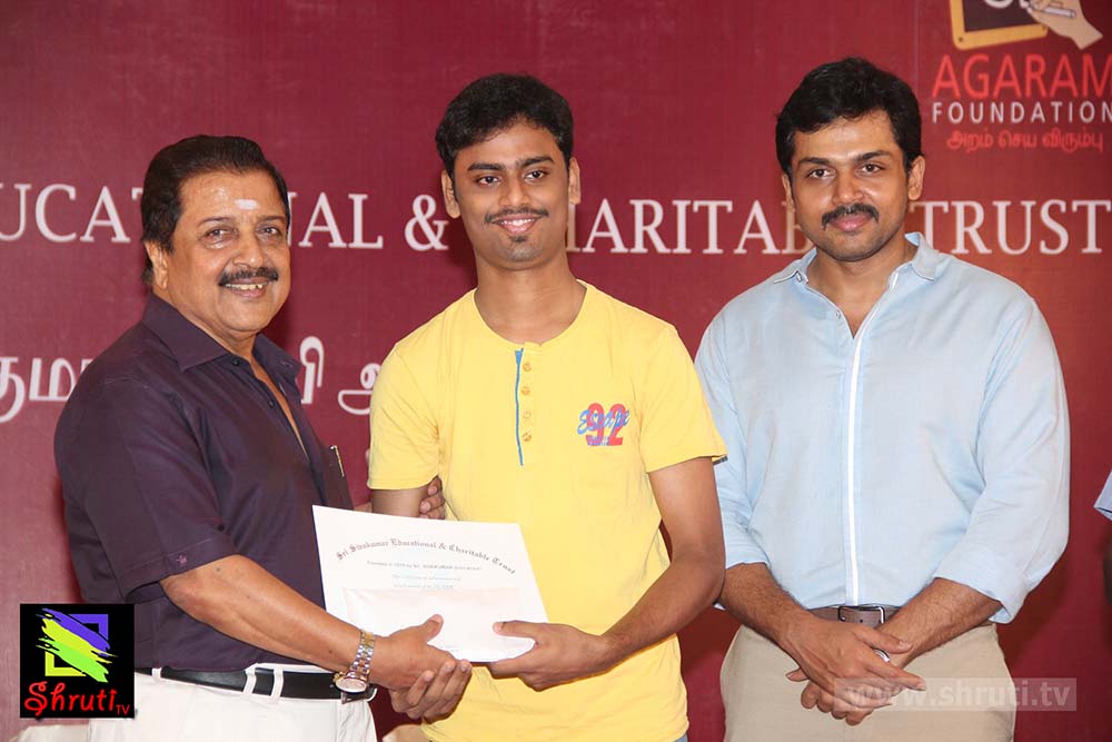 இவ்விழாவிற்கு வந்த அனைவரையும் அன்புடன் வரவேற்றார் நடிகர் கார்த்தி. சிவகுமாரின் மகள் பிருந்தா சிவகுமார், நிகழ்ச்சியை இறைவணக்கம் பாடி தொடங்கிவைத்தார். பின்னர் மாணவர்களுக்கு பரிசளிப்பு நிகழ்ச்சி நடந்தது. அதனை தொடர்ந்து பேசிய சிவக்குமார், 30 அண்டுகள் என் பொறுப்பில் இயங்கிய அறக்கட்டளையை, அதற்குப்பிறகு அகரம் ஃபவுண்டேஷன் பொறுப்பேற்று சிறப்பாக கல்விப்பணி செய்து வருவது மகிழ்ச்சி அளிக்கிறது. சிறிய அளவில் நான் செய்த உதவிகளை, என்னுடைய மகன்கள் இப்போது நல்ல முறையில் இந்த பணிகளை தொடர்ந்து நடத்திவருகிறார்கள். என்னைப் போல ஏழ்மைக் குடும்பத்தில் பிறந்து நன்றாகப் படிக்கிற பிள்ளைகளுக்கு எங்களால் முடிந்த உதவிகளைச் செய்வதில் மிகுந்த மனநிறையை அடைகிறோம். தடைகளைத் தாண்டி பெற்ற முதல் வெற்றி இது. இன்னும் போக வேண்டிய பயணம் வெகுதூரம் உள்ளது. மாணவர்கள் தங்களுடைய கவனம் சிதறாமல், தொடர்ந்து வாழ்க்கையில் முன்னேற வேண்டும்.” என்று கூறினார்.
