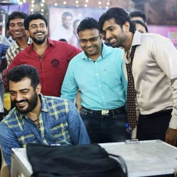 என்னை அறிந்தால் படப்பிடிப்பு தளத்தில் அஜீத், A.M. ரத்னம் அவர்களின் மகன் ஜோதிகிருஷ்ணா, மற்றும் அருண்விஜய்.
