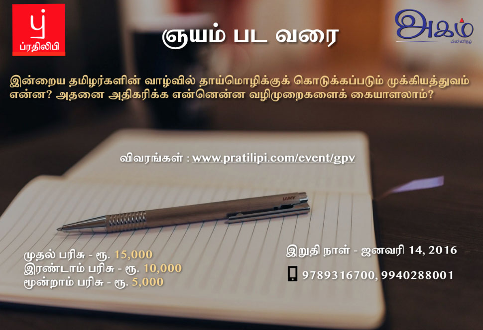 தமிழ் மொழியைப் போற்றிடவும், கொண்டாடிடவும் ப்ரதிலிபி மற்றும் அகம் மின்னிதழ் இணைந்து கட்டுரைப்போட்டி ஒன்றினை நடத்த முடிவு செய்துள்ளது.