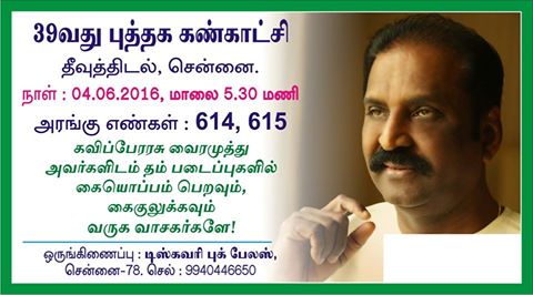இந்த ஆண்டுக்கான சென்னைப் புத்தகக் காட்சி ஜூன் 1 முதல் 13ஆம் தேதி வரை சென்னை தீவுத் திடலில் நடைபெறுகிறது. கவிஞர் வைரமுத்துவின் புத்தகங்களுக்கென்று மட்டும் இரு அரங்குகள் இக்காட்சியில் இடம் பெறுகின்றன.